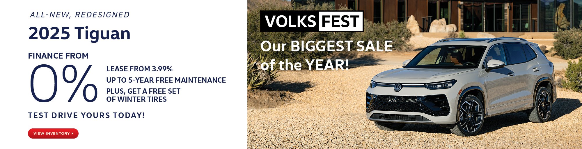 *2025 Taos $88 weekly example lease offer based on 2025 Volkswagen Taos Trendline 4MOTION (Stock#: TS5065736). Lease from $88 weekly, excluding taxes, at 3.99% for 48 months, with $1,786 down payment and residual value of $18,441, taxes extra. 2025 Tiguan $99 weekly example lease offer based on 2025 Volkswagen Jetta Comfortline Auto(Stock#: J25101750). Lease from $93 weekly, excluding taxes, at 5.99% for 48 months, with $1,786 down payment and residual value of $14,943, taxes extra. 2025 Jetta $93 weekly example lease offer based on 2025 Volkswagen Jetta Comfortline Auto(Stock#: J25101750). Lease from $93 weekly, excluding taxes, at 5.99% for 48 months, with $1,786 down payment and residual value of $14,943, taxes extra. 2025 ID.4 $216 weekly example lease offer based on 2025 Volkswagen ID.4 Pro S AWD (Stock#: ID25001755). Lease from $216 weekly, excluding taxes, at 5.99% for 48 months, with $1,739 down payment and residual value of $28,978, taxes extra. Up to 5-Year free maintenance offer includes 2-year VW Loyalty Prepaid Maintenance Plan. 3-year of free maintenance via VW Prepaid Maintenance Plan available to non-current Volkswagen owners. VW Prepaid Maintenance Plan loyalty offer provided at no additional cost available to current Volkswagen owners and previous Volkswagen owners who returned a leased vehicle, or whose finance contract with Volkswagen Financial Services ended, within the past 90 days (some exceptions apply), with purchase or lease of a new, unregistered Volkswagen model. If customer purchases longer maintenance, offer will cover the first 5 years / 75,000 km at the value indicated and customer will pay the balance. Plan covers regular maintenance appointments (for services recommended by VW) within 5 years or 75,000 km (whichever occurs first). Visit https://www.vw.ca/en/shopping-tools/prepaid-maintenance.html for more details. Valid identification and proof of valid loan/lease for/of Volkswagen that was: (i) active for a minimum of 90 days; (ii) in good standing throughout the term; and (iii) that ended within the 90 days prior to the expiry of this offer, are required. Volkswagen vehicles currently being financed/leased with Volkswagen Financial Services are not eligible for the rate reduction. Offer is transferable to an immediate family member living in the same household as the Primary/Co-Primary buyer or lessee. Offer is non-exchangeable for cash. Offers to expire September 2, 2025. Offers subject to change or cancellation without notice. Contact us for complete details.